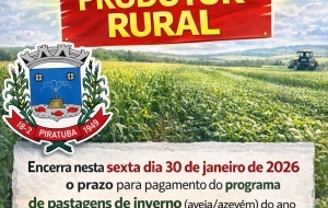 Piratuba: Prazo para pagamento do programa de pastagens de inverno encerra no dia 30 de Janeiro Encerra na sexta-feira, 30, o prazo para pagamento de aveia e azevém referentes ao ano de 2025, cuja aquisições foram... 29/01/2026/ 08:24:13